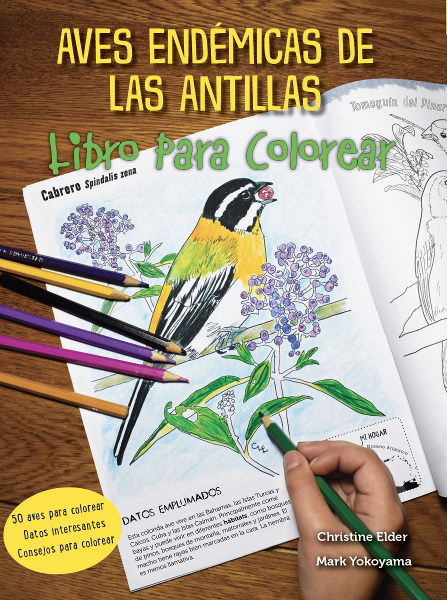 The Spanish language version of the colouring book is available for free download below. It has also been printed in Spanish and is available in Puerto Rico and the Dominican Republic (email info@BirdsCaribbean.org to find out more). Translations of the English text by Mark Yokoyama are by Juan Carlos Fernández-Ordóñez and Maydiel Cañizares. Colouring book covers, including front, back, colouring tips, and fold-in colouring key (PDF) – click here for free download in Spanish. Colouring book pages, including background information, West Indies map, colouring pages, activities, and glossary (PDF, 64 pages) – click here for free download in Spanish.