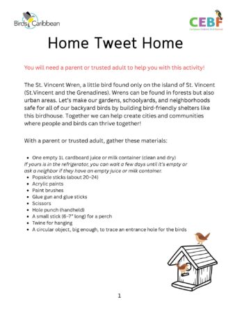 FOR KIDS : The St. Vincent Wrens can be found in forests but also urban areas. In fact this is true of many species of wrens in the Caribbean and beyond, meaning they are often common ‘backyard birds’. You can make your garden, or schoolyard safe for all of our backyard birds by building bird-friendly shelters like the birdhouse in our “Home Tweet Home” crafting activity. Together we can help create cities and communities where people and birds can thrive together!